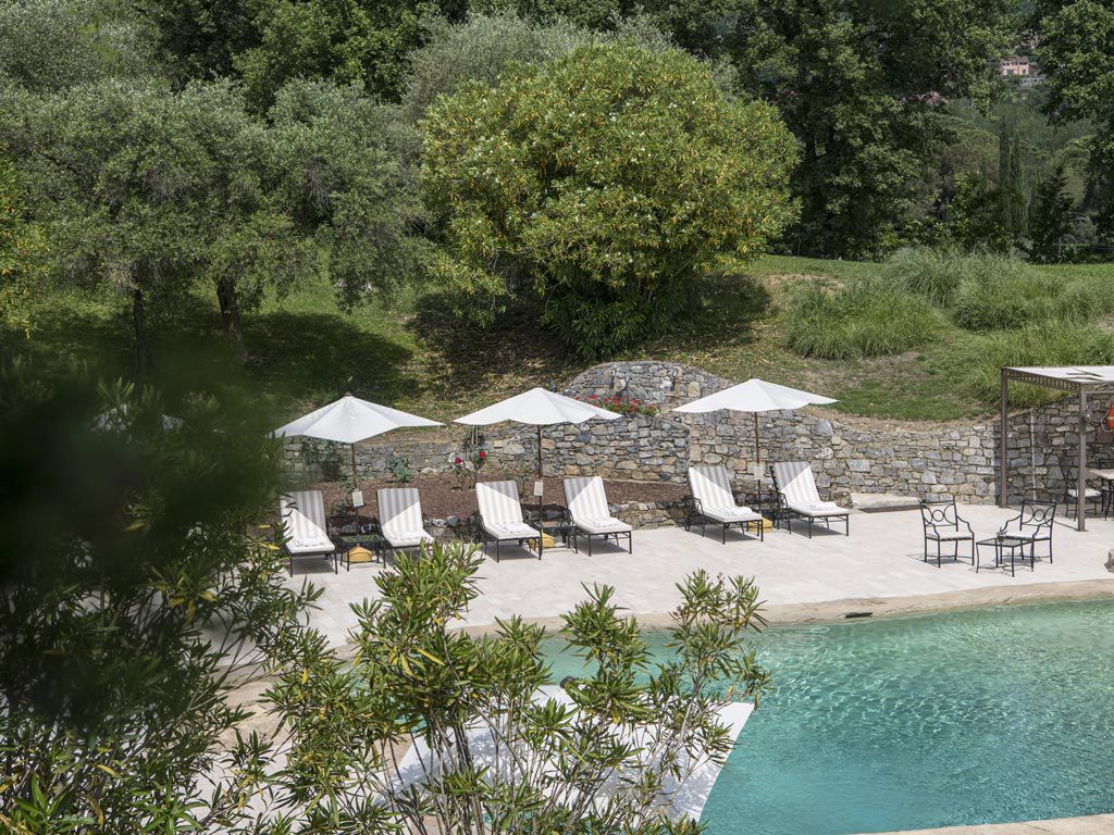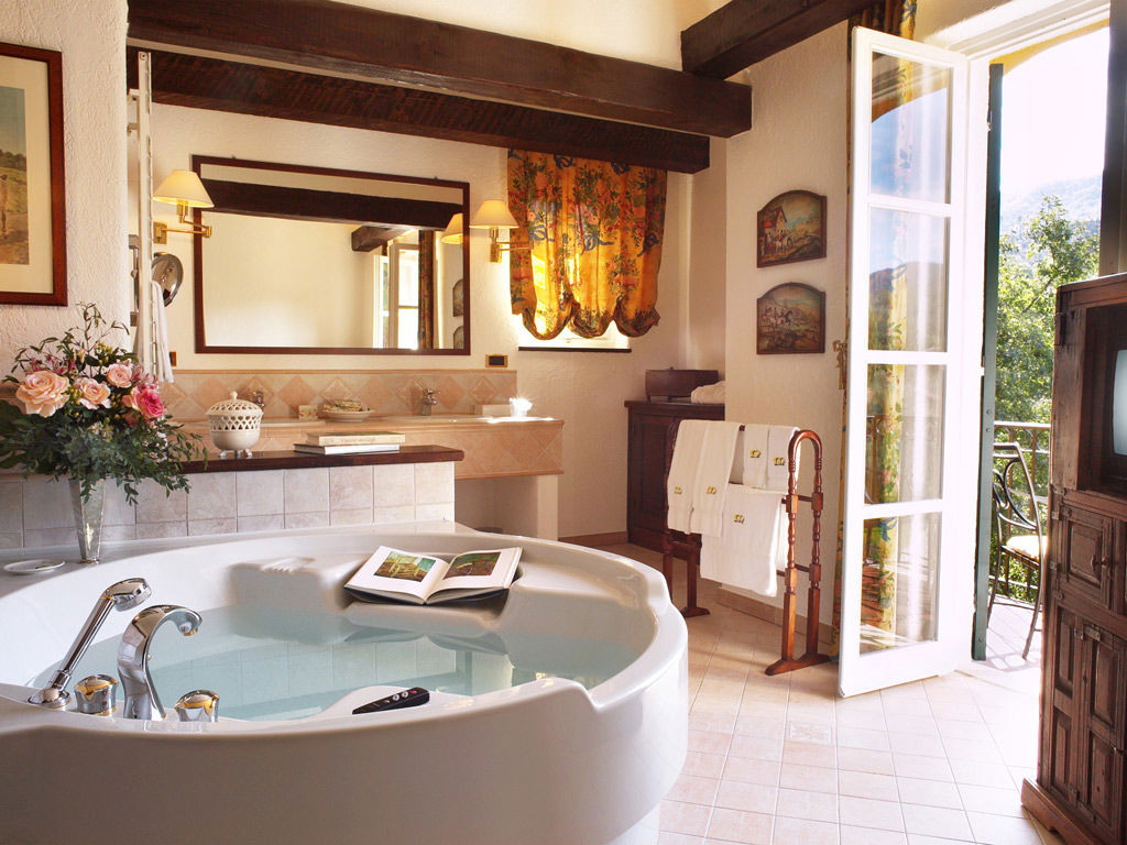 This romantic and relaxing hotel located halfway between Monaco and Portofino was designed and constructed in 1971 by Luisa Berto de Segre, a few years after her sister Teresa de Berto Galleani had built an eighteen hole golf course. Everything was designed in the style of nearby Provence: large arches and canopies, stone walls, antique tile roofs, warm and bright colors.
